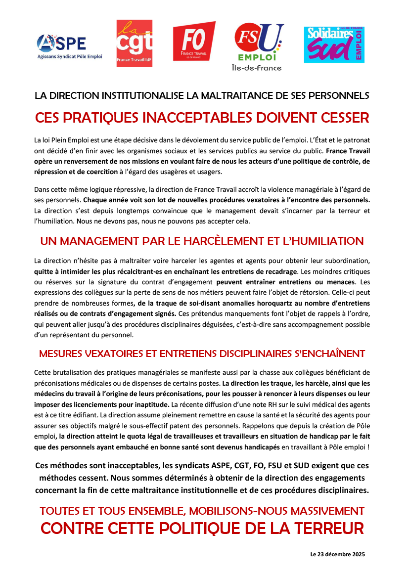LA DIRECTION INSTITUTIONALISE LA MALTRAITANCE DE SES PERSONNELS