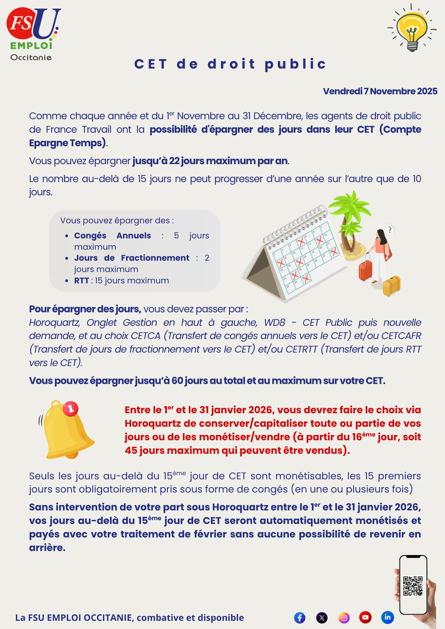 Dans cette communication, la FSU Emploi Occitanie vous informe sur le CET de droit public.