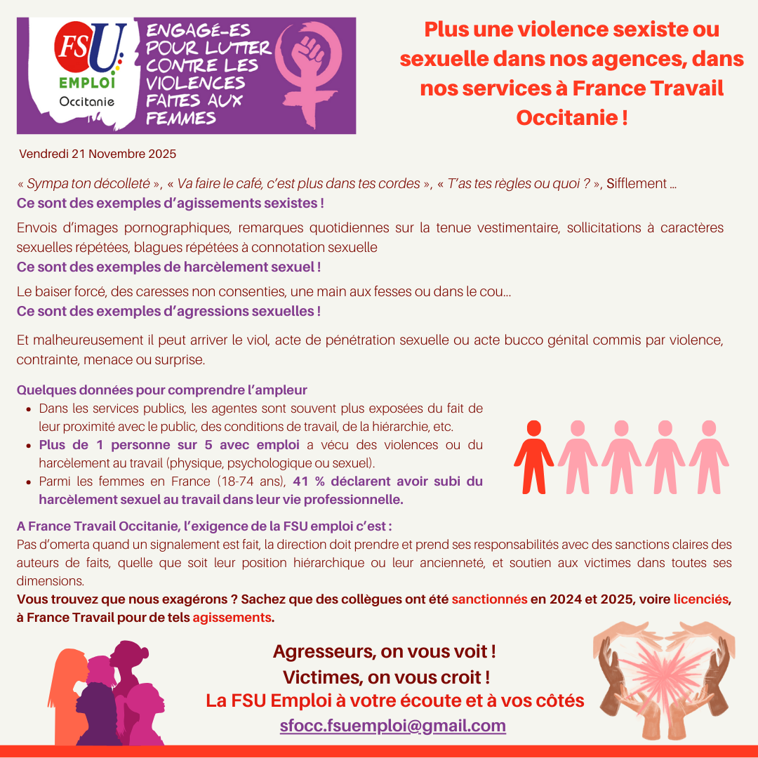 Dans cette communication, la FSU EMPLOI Occitanie communique sur la Journée internationale de lutte contre les violences faites aux femmes.