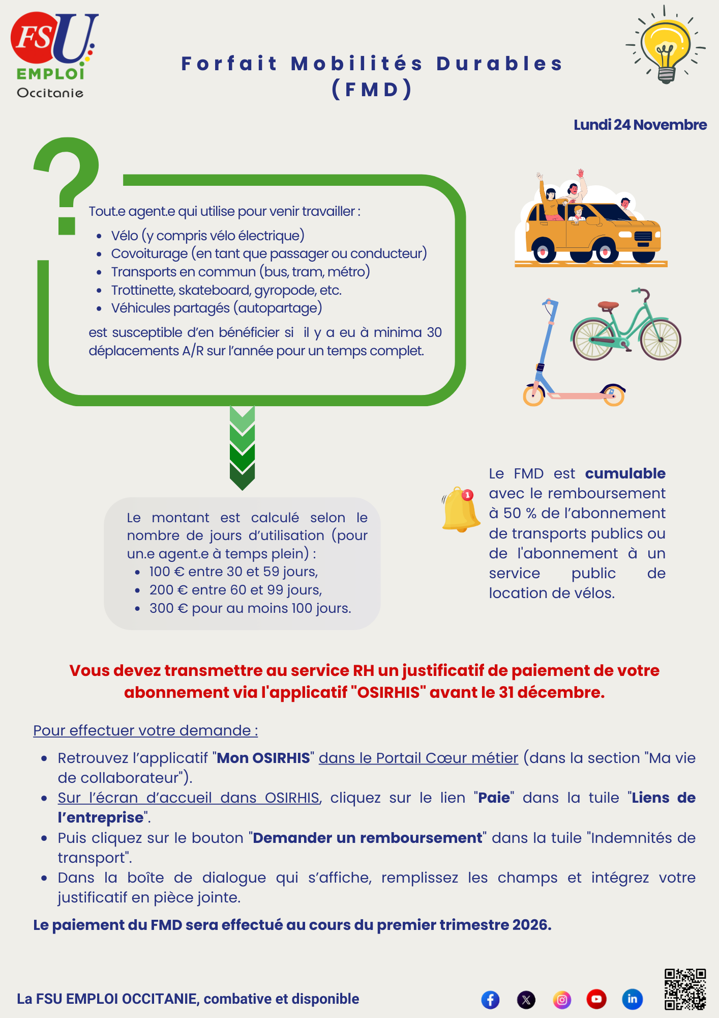 Dans cette communication, la FSU EMPLOI Occitanie vous informe sur le FDM - Forfait Mobilités Durables.
