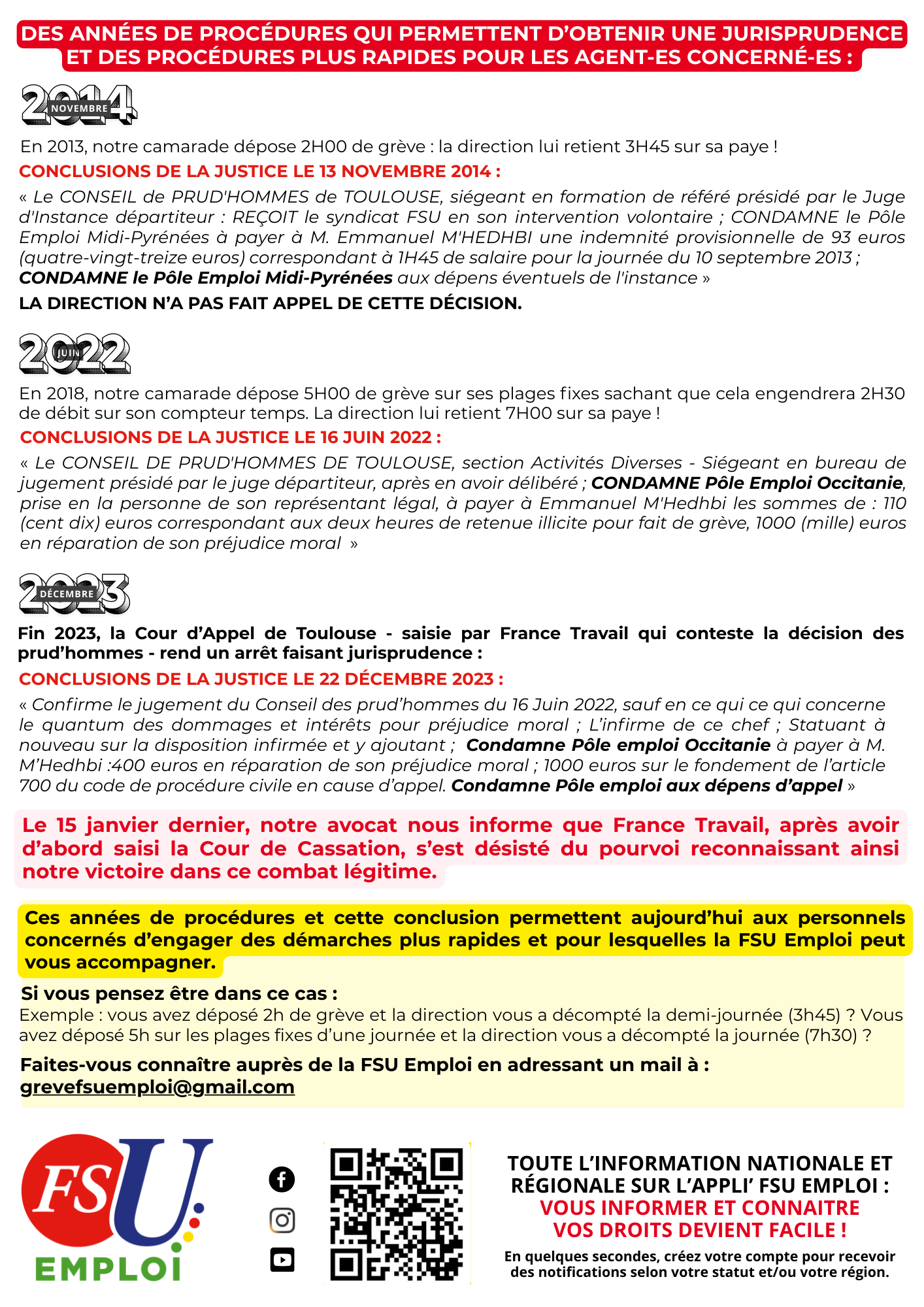 Depuis 2014, un Délégué syndical de la FSU Emploi mène un combat déterminé contre la Direction Régionale Occitanie et la Direction Générale pour faire respecter un droit fondamental : le droit de grève des agent·es de France Travail. Face à l’acharnement de FT, aux manœuvres dilatoires et au mépris affiché du droit du travail, notre camarade n’a jamais cédé.