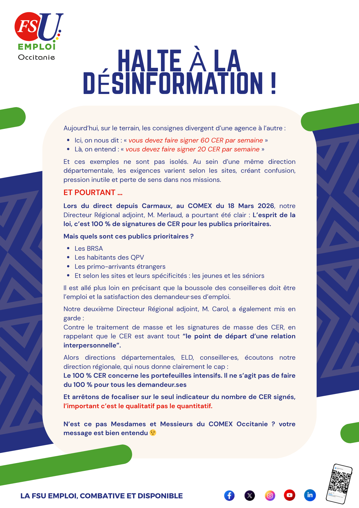 Dans cette nouvelle communication, la FSU Emploi Occitanie vous informe sur le CER, suite au COMEX du 18 Mars 2026.