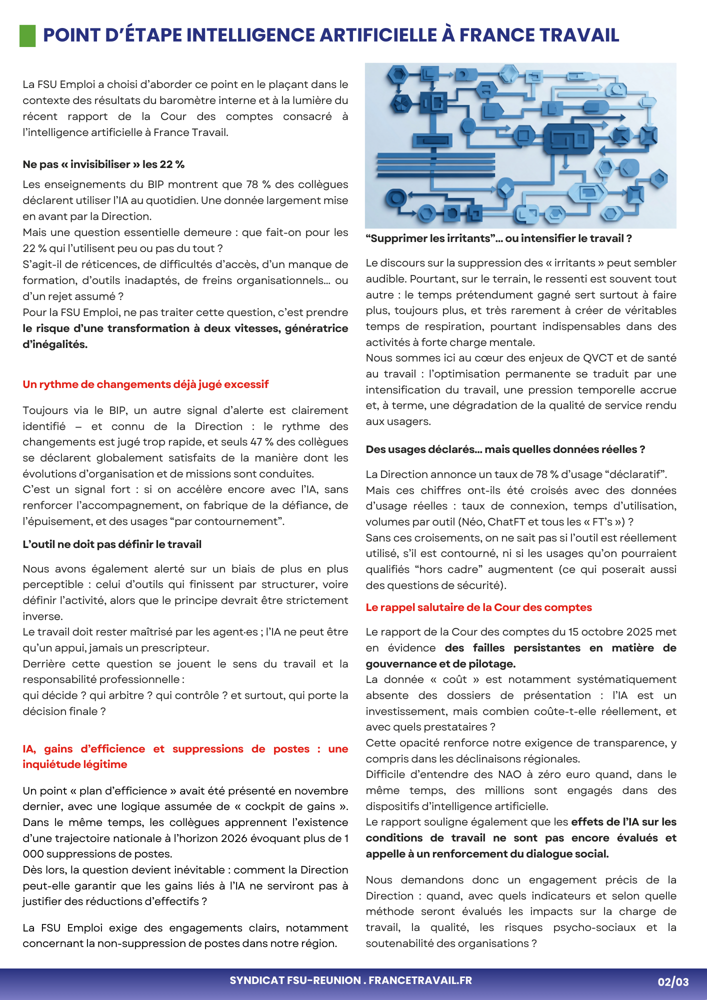 Derrière le discours de gains d’efficience et d’innovation, la FSU Emploi questionne le sens de cette fuite en avant technologique et ses impacts bien réels sur le travail des agent·es, leurs conditions d’exercice et le service rendu aux usager·ères.