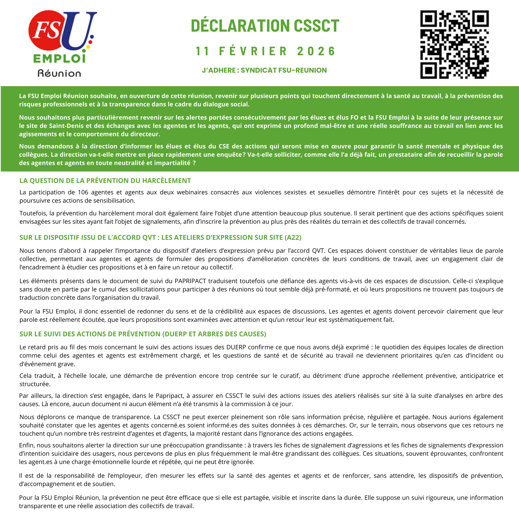 Déclaration de la FSU Emploi à la CSSCT du 11 février 2026