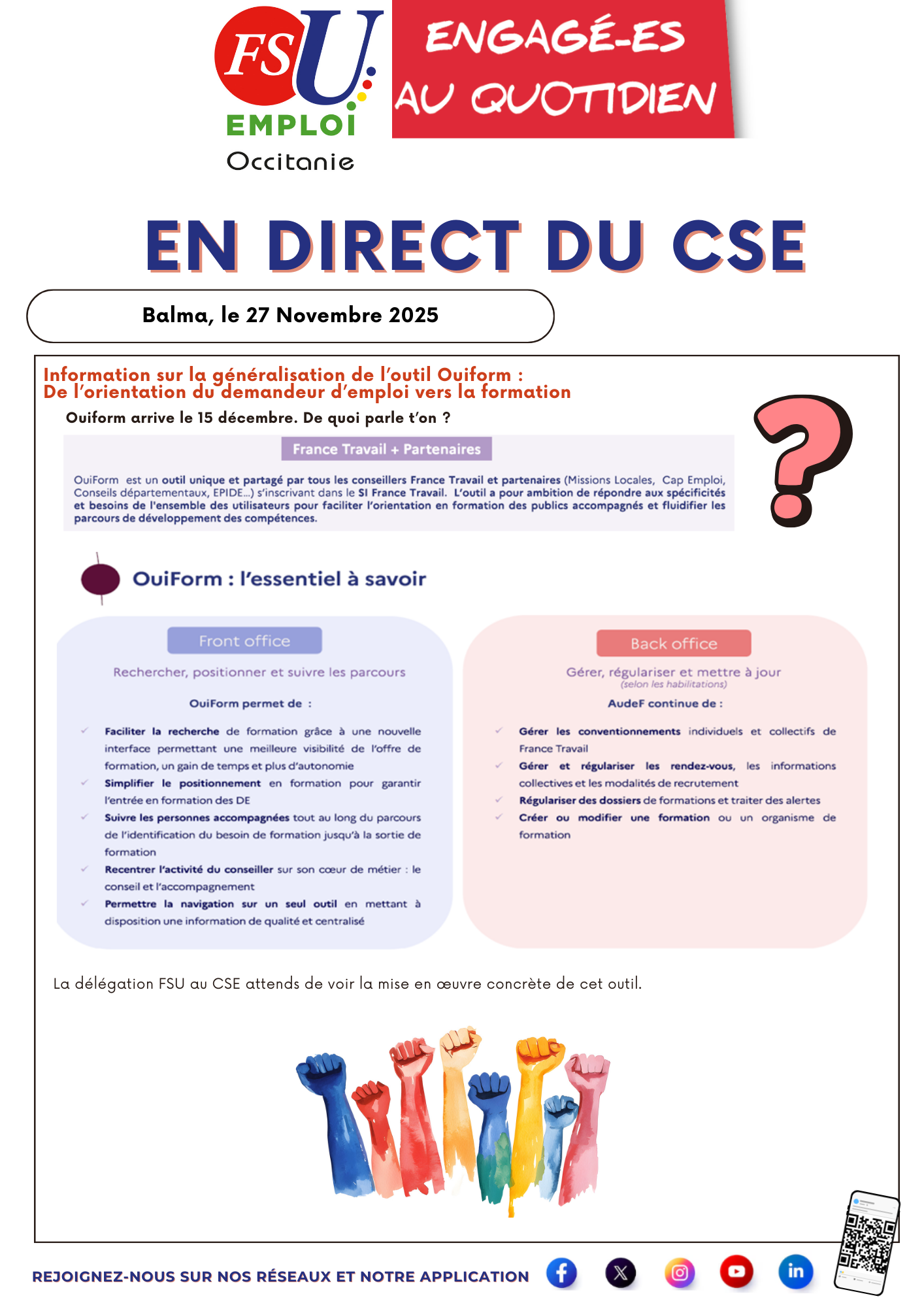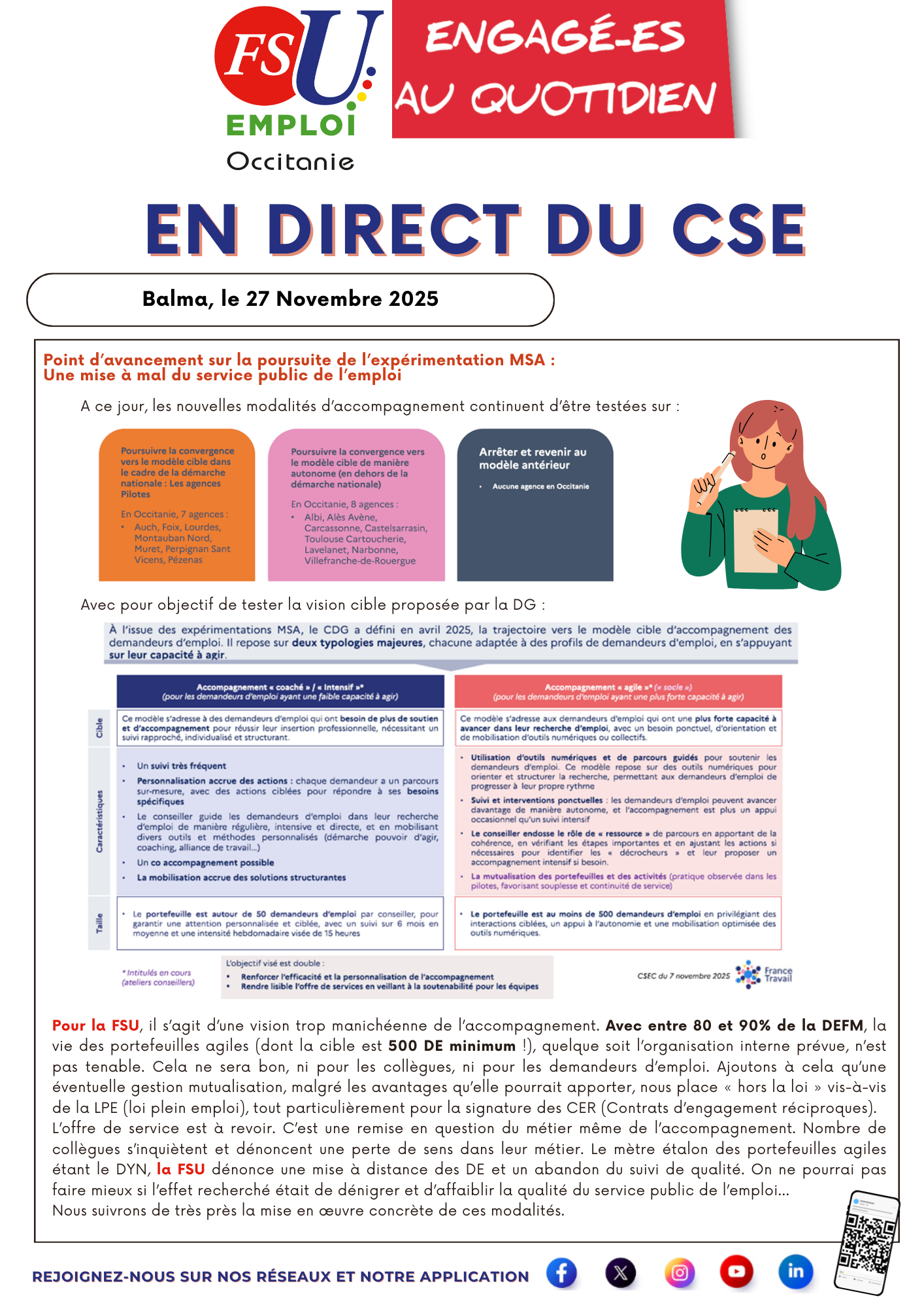 La FSU Emploi Occitanie vous informe : En Direct du CSE - 26 et 27 Novembre 2025