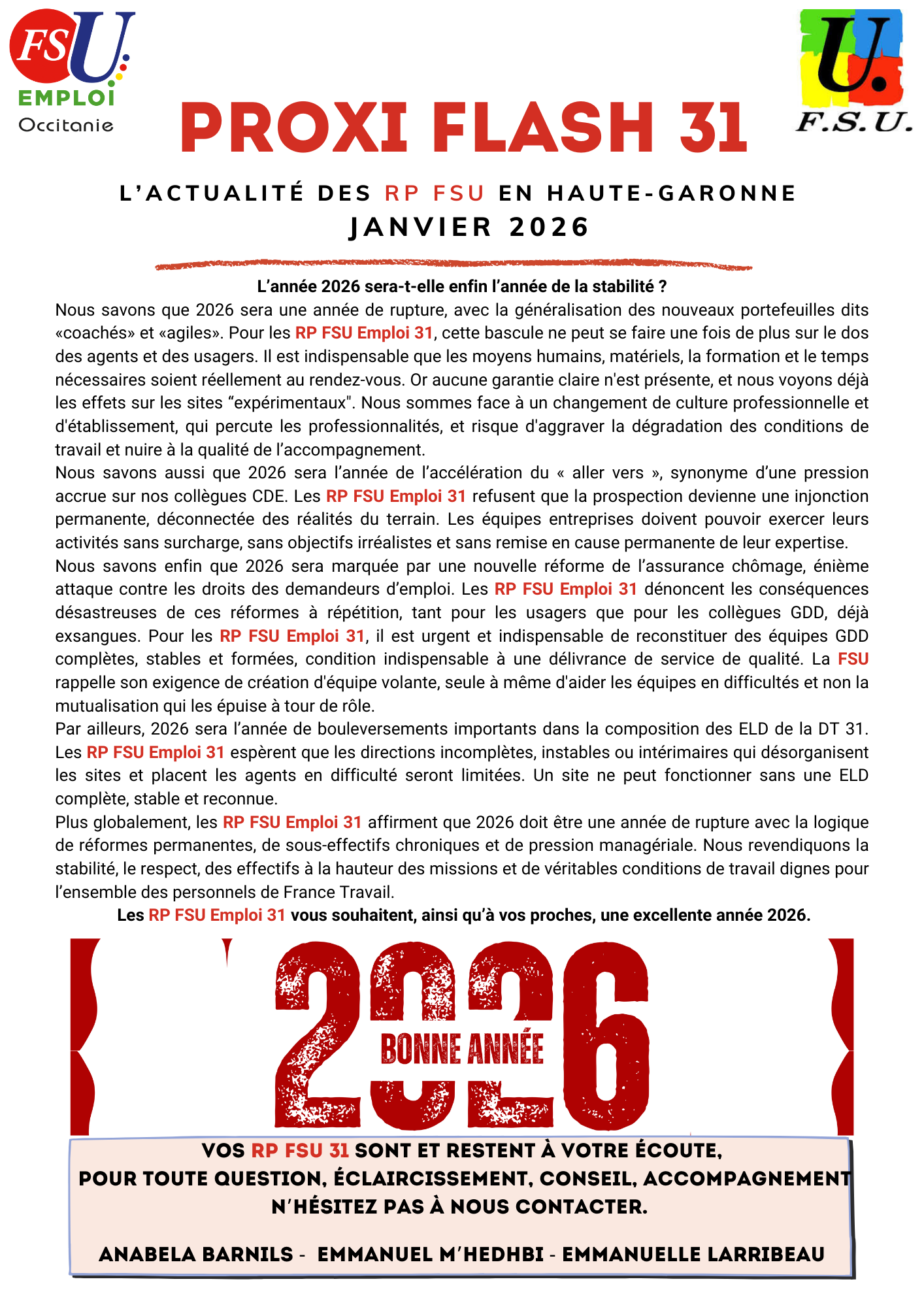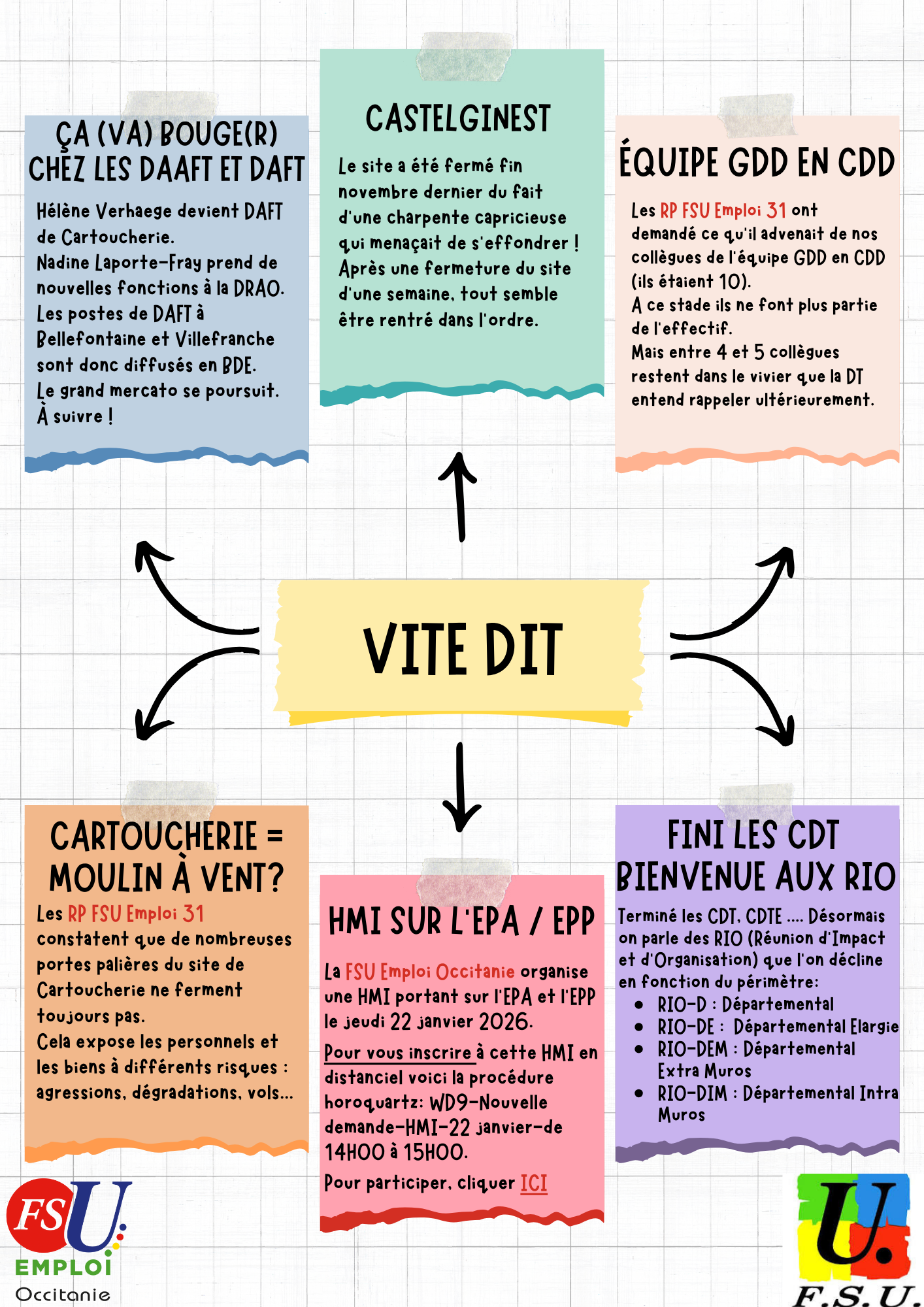 Vous trouverez ci-dessous la dernière communication de vos RP FSU Emploi 31 suite à réunion qui s'est tenue jeudi 8 janvier à la DT 31.